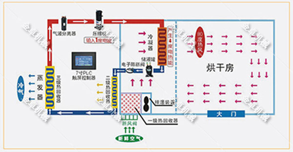 菊花烘干房是利用逆卡諾原理,制冷劑(大部分為混合制冷劑)被壓縮機(jī)壓縮,變成高溫高壓的氣體,通過管路(銅管)進(jìn)入換熱器(冷凝器)中,然后再通過風(fēng)機(jī),將換熱器(冷凝器)產(chǎn)生的熱量送至烘干房內(nèi)對菊花等物料進(jìn)行加熱、烘干,從而使菊花得到干燥,濕氣由排濕口排出,排濕系統(tǒng)有熱回收裝置,回收的熱量用于加熱新風(fēng),可節(jié)約百分之60~百分之70的新風(fēng)預(yù)熱能耗。